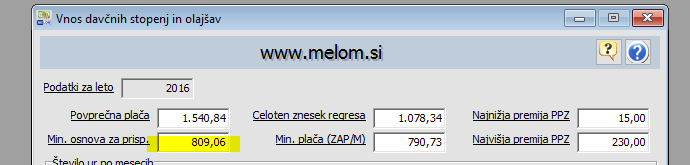 Najnižja osnova za obračun prispevkov za socialno varnost za osebe v delovnem razmerju, za izplačila od 1. 1. do 29 .2. 2016, znaša 800,93 eur (52 % povprečne letne plače zaposlenih v RS, preračunana na mesec, ki za leto 2014 znaša 1.540,25 eur) ( vir: FURS – prispevki za socialno varnost ).