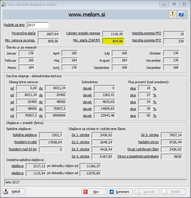 Za pravilen obračun je potrebno popraviti podatek o minimalni plači v Tabele – Davčne stopnje in olajšave, lahko pa tabelo osvežite s klikom na gumb Naloži.
