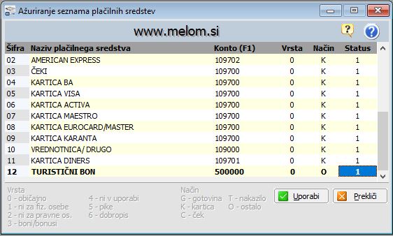 V naših programih za sprejem bonov niso potrebne spremembe, račune izdajate kot običajno. Če spremljate prodajo tudi po vrstah plačil, potem v meniju Tabele -> Vrste plačil vpišite še turistični bon in pri vpisu pazite, da boste izpolnili vsa polja – zaključite vnos z Uporabi. Tako bo tudi pri pregledu plačil razvidno, koliko je bilo prejetih bonov.