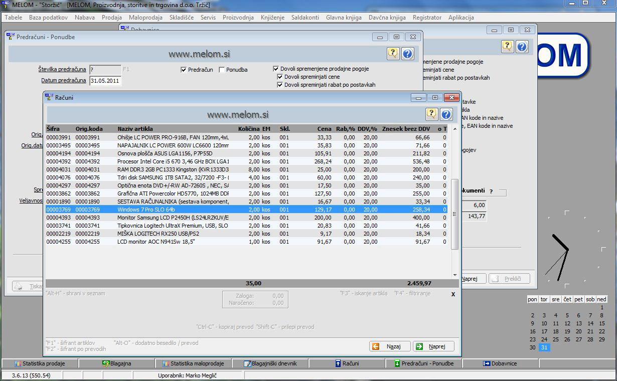 • statistika prodaje s primerjavo z drugim obdobjem ter grafični prikaz